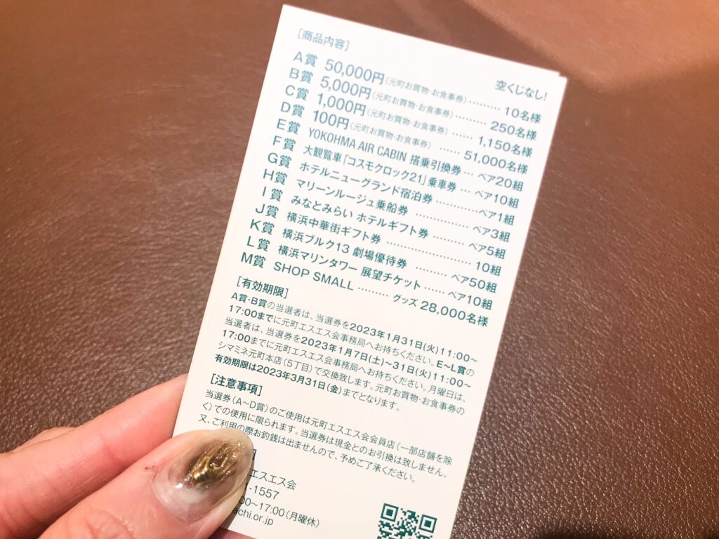 1等は「元町オリジナルお買物・お食事券(50,000円)」を始め、空くじなしで様々な景品がもれなく当たります!