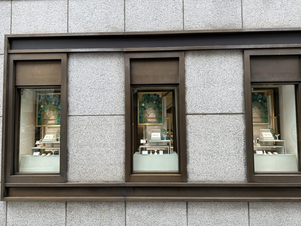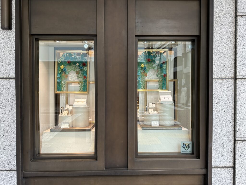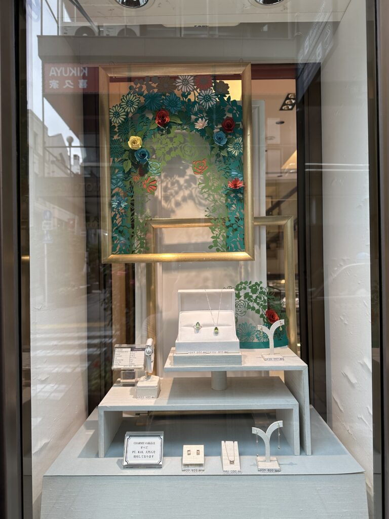 色とりどりの花が咲く、躍動感のある新緑のウィンドウディスプレイとなっています。